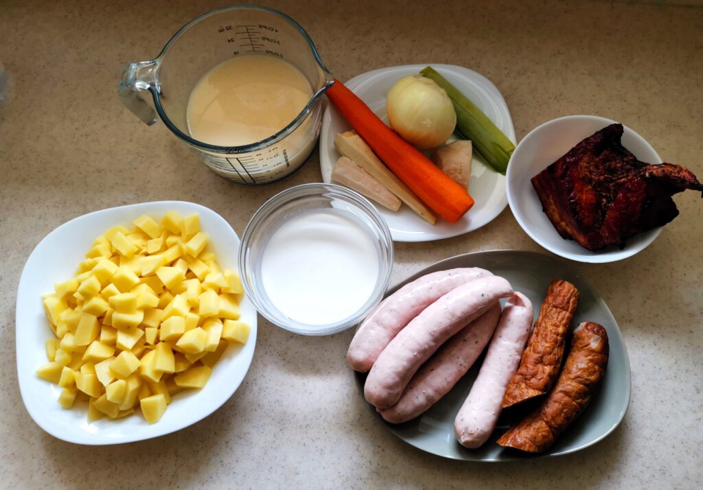 - 350g wędzonego boczku lub 500 g żeberek wieprzowych